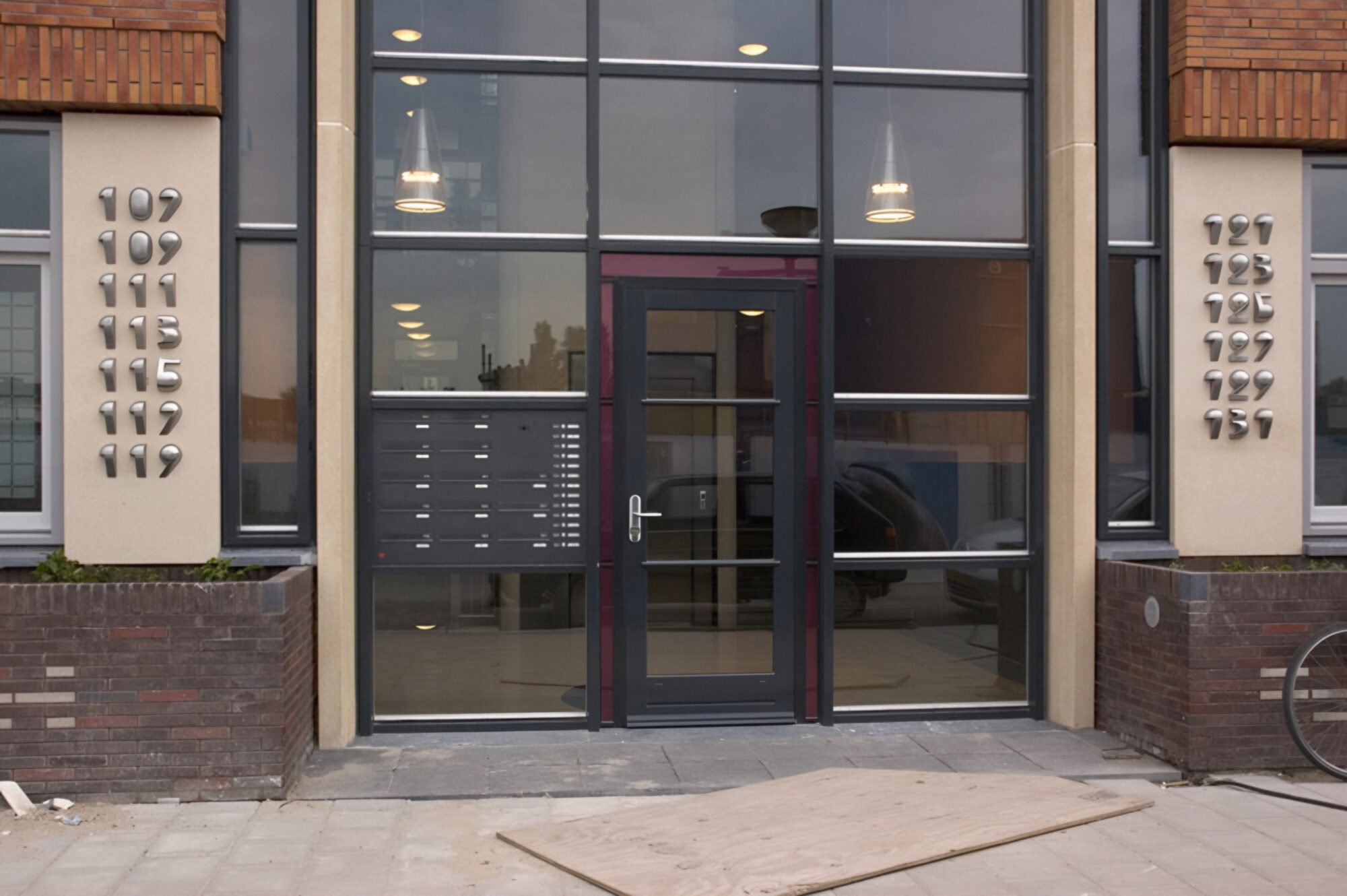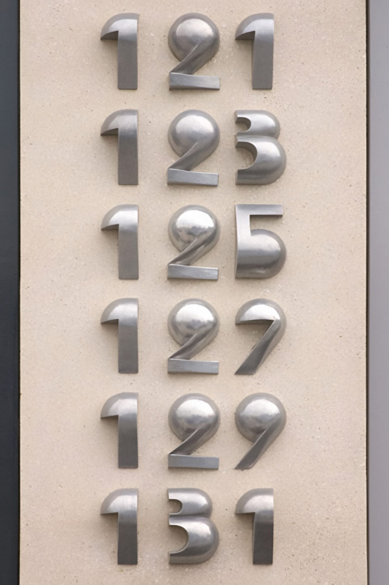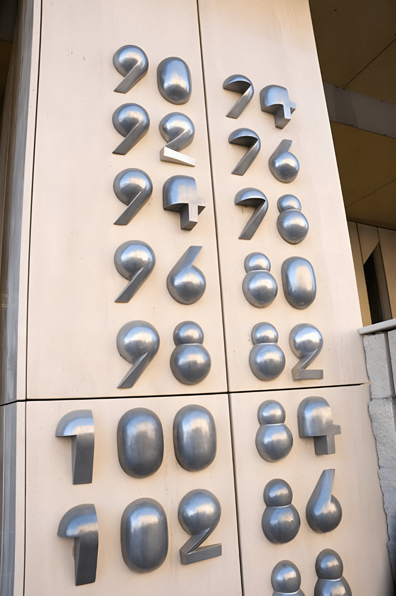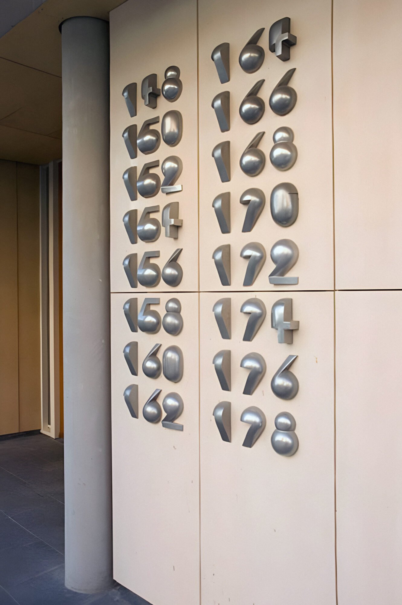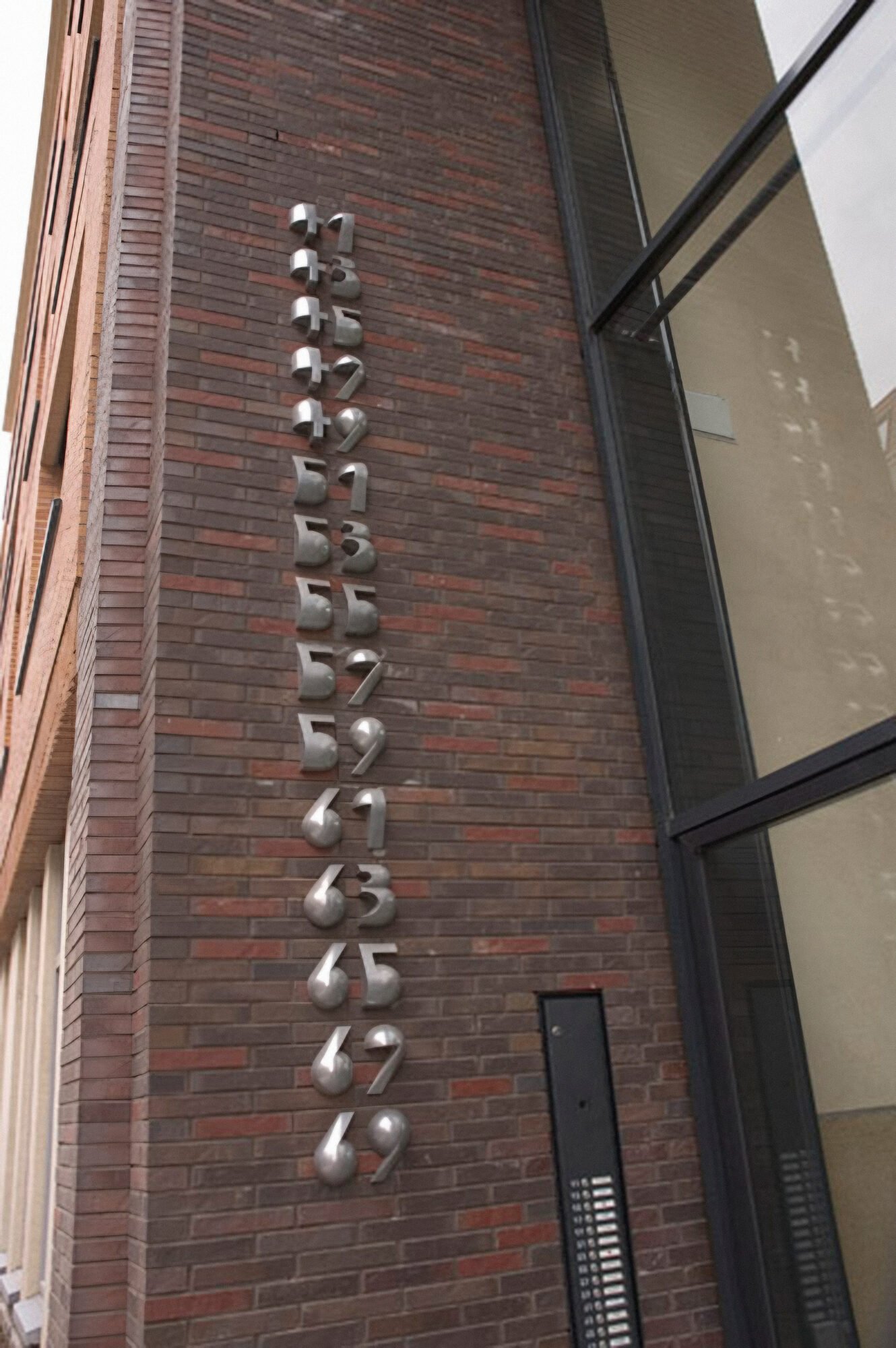 For Oudshoorn, an important principle was that each resident would have a sculpture of their own. To achieve this, he designed three-dimensional apartment numbers in outsized format, cast in aluminium. The numbers are the most individual references to the people who live in the respective apartments, and they are hung at eye level, so they can be touched. As every apartment has a separate address, each resident has his or her own sculpture, in the form of number on the facade. The result is a long series of numbers that hang vertically on the façade of the building, like huge, shining drops of rain. Each cipher measures 16.5cm x11cm x5.5cm. There are about 2000 ciphers in all.